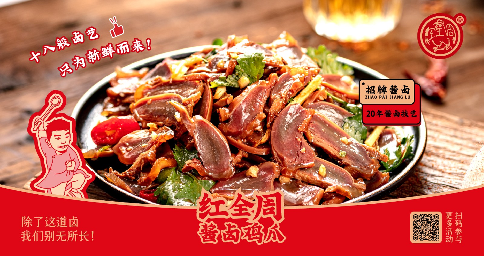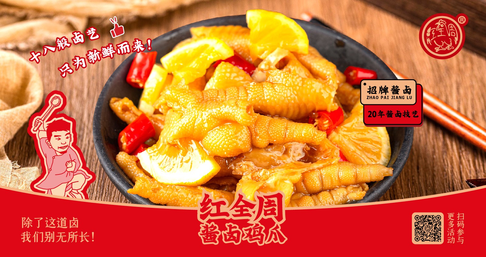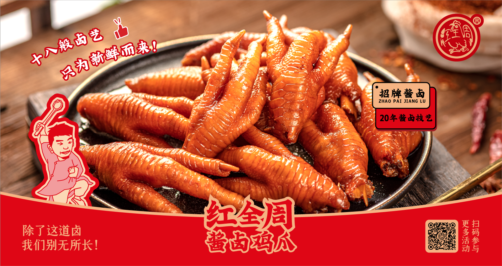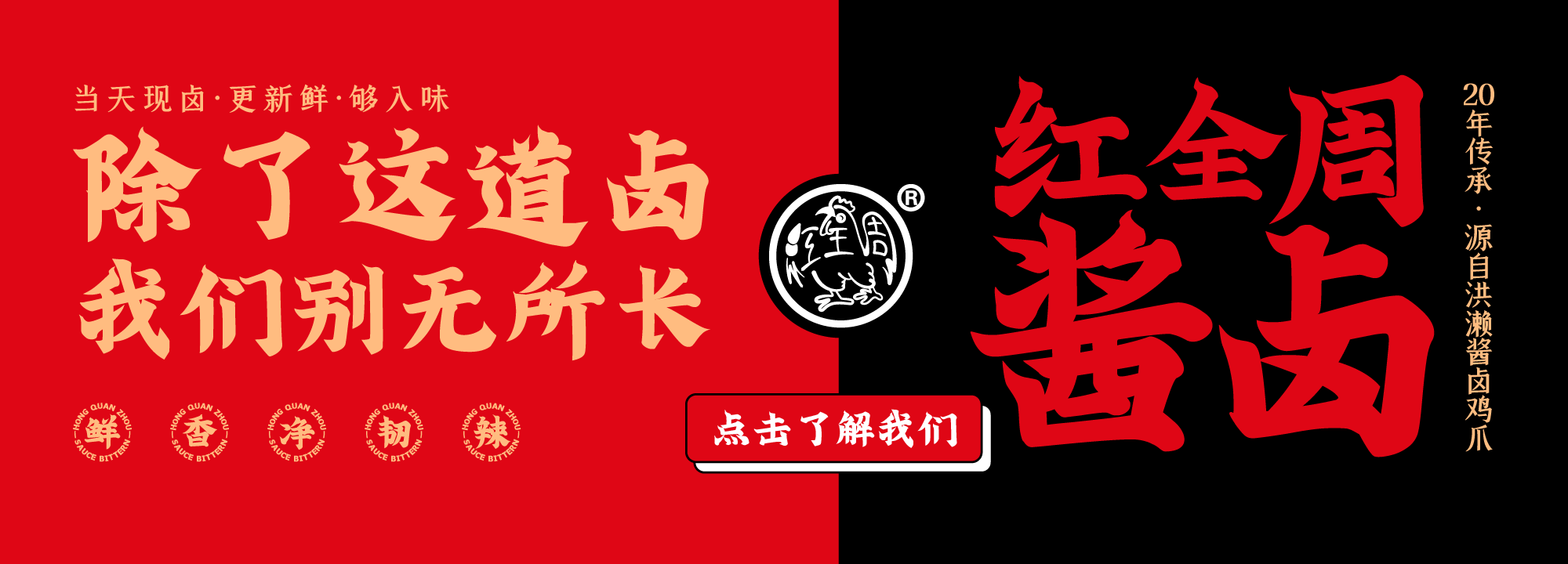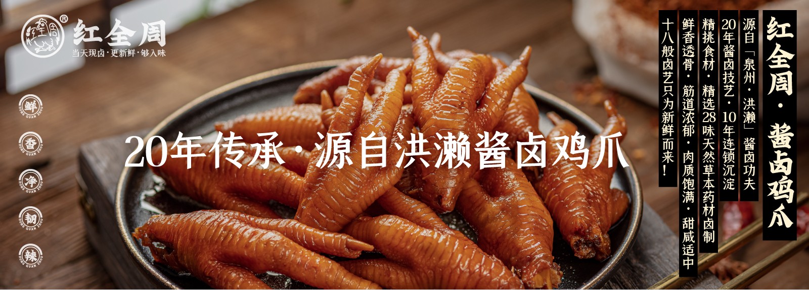 紅全周品牌創(chuàng)立于2012年,其生產(chǎn)總部坐落在以“紅全周雞爪”聞名的福建泉州市南安洪瀨鎮(zhèn),經(jīng)張福來(lái)師傅多年研制而成的獨(dú)家秘方,獨(dú)特的鹵制工藝,以“鮮、香、韌、辣”的特點(diǎn),贏(yíng)得廣大食客的交口稱(chēng)贊。紅全周繼承中華美食傳統(tǒng),堅(jiān)持以“細(xì)微處見(jiàn)風(fēng)范,毫厘間定乾坤”的服務(wù)準(zhǔn)則,遵循現(xiàn)代健康飲食理念,精選上等食材,致力為消費(fèi)者提供安全、健康的美食新體驗(yàn)。